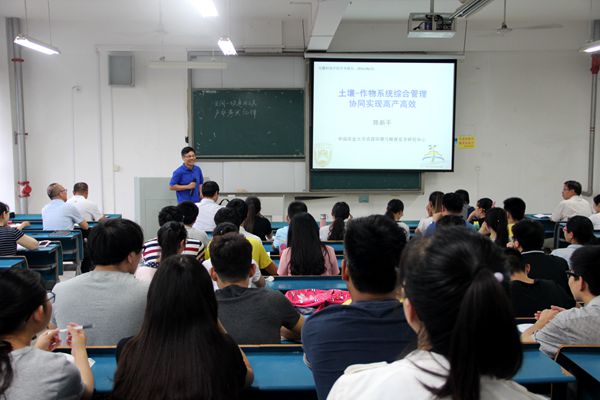 6月21日下午,中国农业大学资源与环境学院陈新平教授,应邀来校进行学术交流,在新A108教室作了题为《土壤-作物系统综合管理协同实现高产高效》的学术报告。党委委员、副校长汪建飞出席并主持报告会。资环学院副院长肖新教授参会,农业资源与环境校级重点学科全体成员、生科院、农学院部分老师以及相关专业研究生本科生近百人聆听了报告会。
