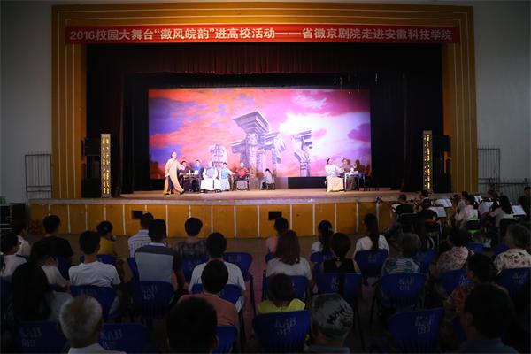 6月15日下午,安徽省教育厅、中共安徽省委宣传部、安徽省文化厅统筹安排的2016年校园大舞台“徽风皖韵”活动走进我校,省徽京剧院在校大学生活动中心送演京剧《程长庚》,千余名师生同聚一堂,品味国粹艺术。