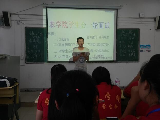 为培养高校大学生综合素质,引导新生自觉树立“自我管理、自我教育、自我服务”意识和能力,农学院学生会认真谋划、积极开展“吐故纳新”——招新工作,9月22日中午在求知楼二楼208、209、210教室举办首轮面试。