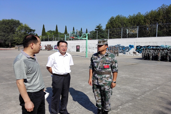 丁景良等一行首先看望了军训的教官们,向他们询问并了解学生们的军训状态、身体状况和训练成果。在听完教官的讲解后,丁景良和赵伟峰对教官们连日来的辛勤付出表示衷心地感谢,同时希望教官对学生们严格要求,训练出更好的风貌,圆满完成军训的各项训练任务。