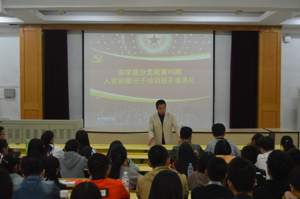 10月12日下午,农学院在学知楼217教室隆重举行第45期分党校开班典礼。典礼由党总支秘书张轶辉主持,党总支书记何世潮讲话。