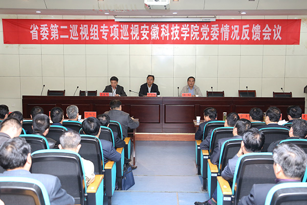 根据省委巡视工作领导小组的部署,省委第二巡视组向安徽科技学院党委反馈巡视情况。2016年10月26日,省委第二巡视组组长王永和,副组长姚俊向安徽科技学院党委书记蒋德勤传达了省委书记李锦斌关于巡视工作的重要讲话精神,反馈了巡视有关情况。之后,王永和代表巡视组向安徽科技学院党委进行了反馈,对巡视整改工作提出要求。蒋德勤主持会议并作表态发言。