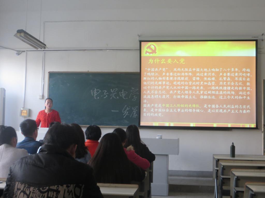 11月12日下午,电气与电子工程学院学生党支部在学知楼112、114教室举行了“推优”考察对象答辩会。光电工程系副主任何恩节博士应邀担任教师评委,所属学生党支部书记、党员代表和辅导员组成评委团,电子光电学生党支部所属专业班级的38名“推优”考察对象参加答辩。答辩会由学院党总支秘书、团委书记段素梅主持。