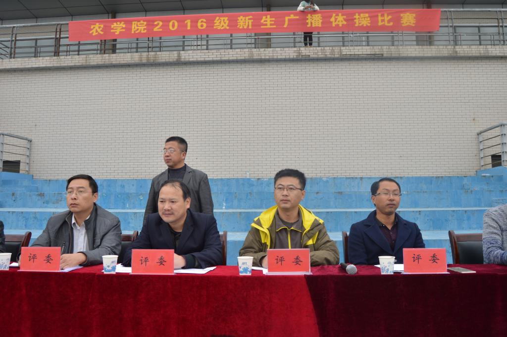 为认真响应落实国家“阳光体育运动”的号召,进一步增强同学们的体质,提高广播体操的动作质量,展现当代学生的青春风采,11月12日上午九点,农学院在西区风雨操场隆重举行了广播操比赛。莅临本次比赛的评委有外国语学院党总支秘书分团委书记张海亮、资源与环境学院党总支秘书分团委书记吴国良、电气与电子工程学院正科级辅导员余维发、财经学院辅导员才治军、食品药品学院学生会主席刘源和管理学院学生会主席张志。农学院党总支书记何世潮、分团委书记张轶辉、辅导员姚祎出席并观看比赛。