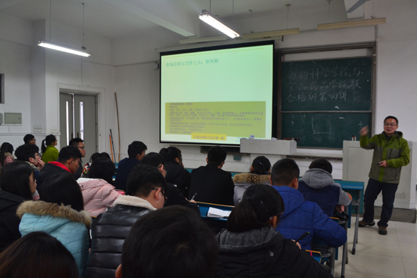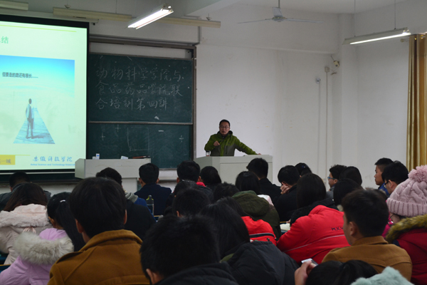 11月27日下午2:00,动物科学学院与食品药品学院学生会干部联合培训第四次培训在新B404教室进行。动物科学学院分团委书记胡文靖担任本次培训的主讲。