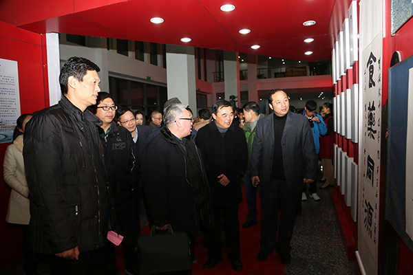 翰墨飘香歌盛世,丹青亮彩写华章。由校党委宣传部、食品药品学院主办,食品药品学院分团委学生会承办的安徽科技学院第五届食品药品文化节系列活动之“帝城”杯书法绘画作品展于11月30日在新图书馆一楼展厅拉开帷幕。蚌埠市书法家协会副主席齐学仁、蚌埠市书法家协会主席团主席王若升、蚌埠市书法家协会理事李鸿炎、蚌埠市书法家协会会员崔新旺、凤阳县文联主席吕建东、凤阳县书法家协会主席罗传厚、凤阳县美术家协会副主席黄宝昌、凤阳凤画研究会秘书长谢冬梅等受邀莅校指导。