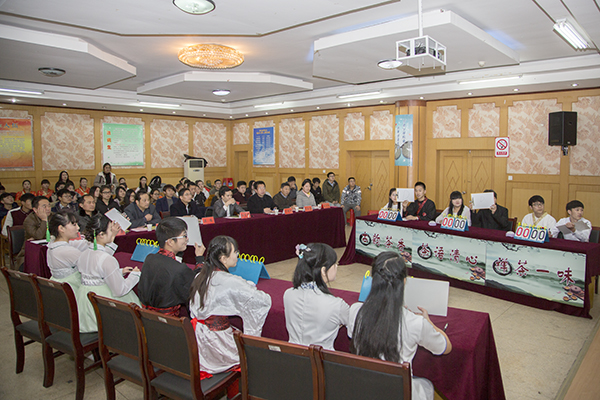 本次大赛包括茶文化知识竞答和创意主题茶艺表演两个部分。知识竞答时,来自六组团队的12名代表在答题桌前各显神通,凭借慧心妙舌巧解道道难题,不仅向评委和观众充分展示了他们对茶文化的了解,还不时引得会场掌声阵阵。抢答环节的设置更是妙趣横生,不仅考验了选手对茶文化知识的了解,更进一步考验了团队成员之间那种默契的配合。表演的选手们或是身着白裙汉服,或是典雅旗袍,依次对红茶盖碗泡法、绿茶玻璃杯泡法、乌龙茶壶盅单杯泡法茶艺进行了展示。动作娴熟,手法轻柔,伴随着行云流水般的音乐将传统的茶艺表演与独具特色的水果雕刻以及琴、棋、书、画、朗诵、情景剧等众多元素融合,将会场气氛推向顶峰,充分烘托了传统茶艺之美。