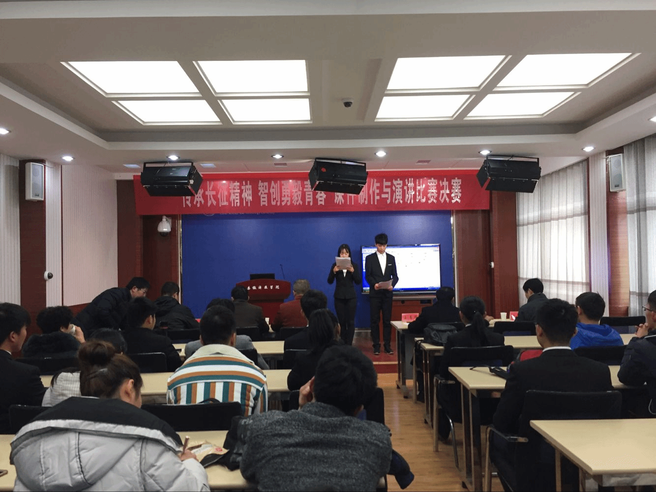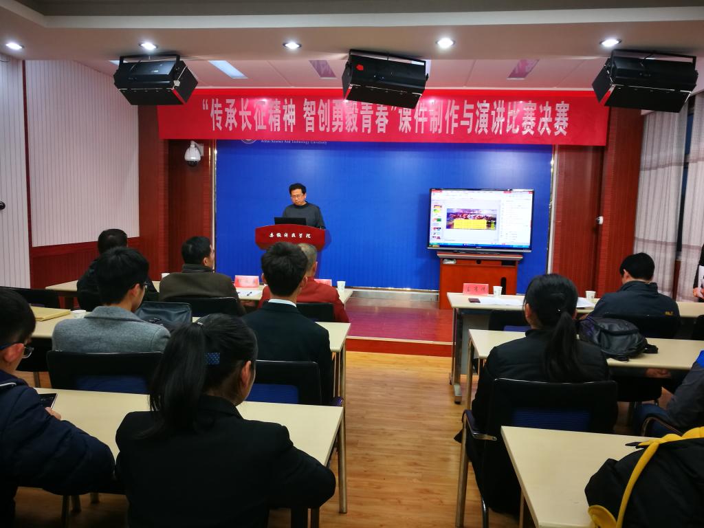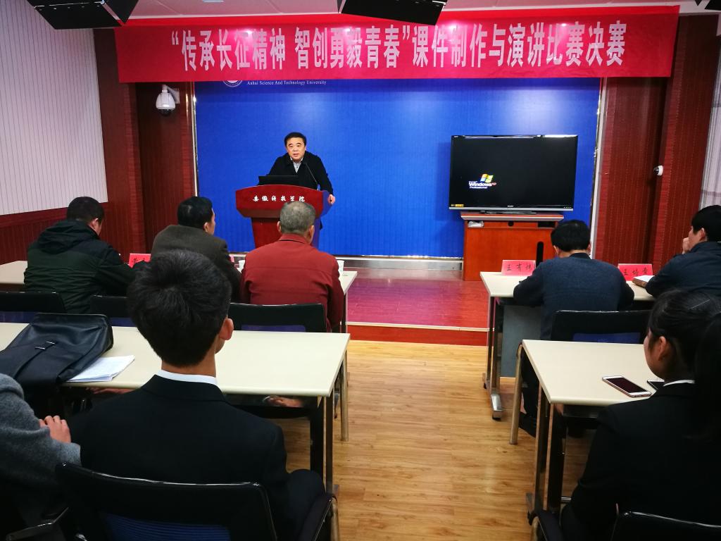 12月24日下午,由马克思主义学院、宣传部、学工部、教务处和团委联合主办,人文学院党总支承办的“传承长征精神 智创勇毅青春”课件制作与演讲比赛决赛在学知楼录播室举行。校党委副书记韦文联应邀出席并讲话。马克思主义学院院长王有炜,体育教学部主任孙志双,学生处处长(学工部部长)何永勇,教务处副处长王培章,校团委副书记黄立义出席并担任决赛评委。相关学院党总支、分团委书记以及思政理论课教师出席并观看比赛。比赛开幕式由人文学院党总支书记杜士凤主持。