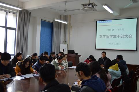 12月28日下午,农学院在院会议室召开了期末班级主要学生干部会议。党总支副书记沈树周,辅导员张俊、姚祎,各班级班长、团支书,院学生会、社联与金禾创业中心主席团同学参会。
