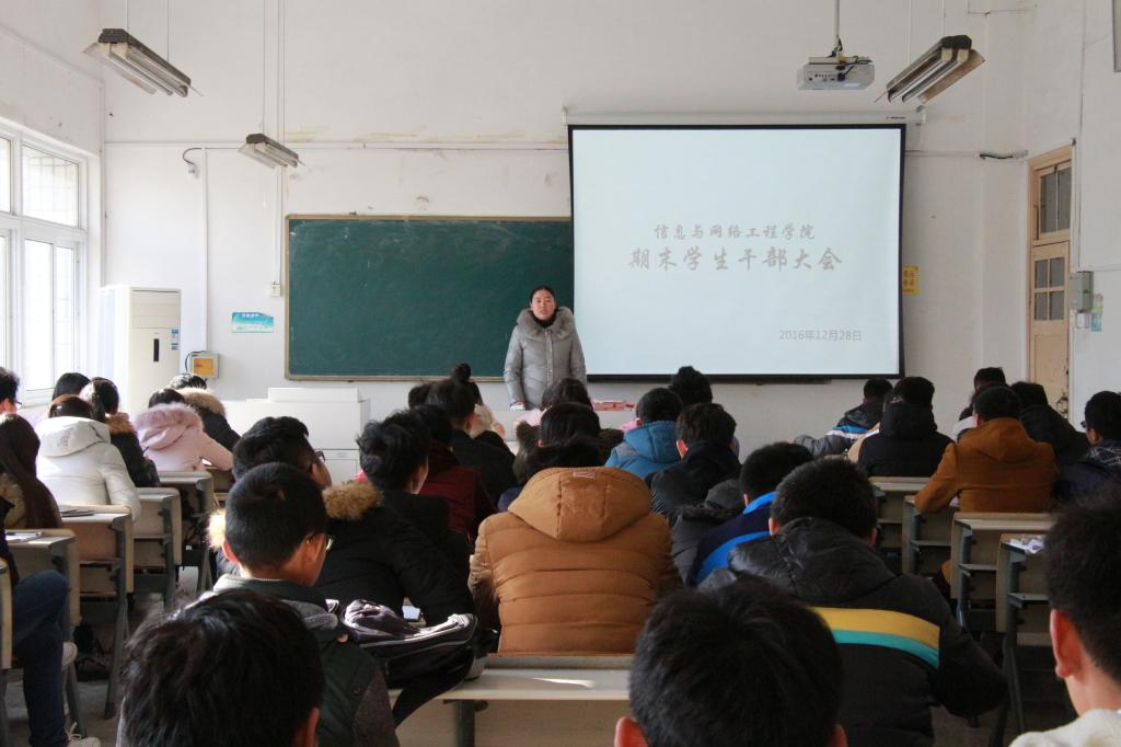 12月28日下午,信息与网络工程学院在学知楼110教室召开期末学生干部会议。学院各班级班长、团支书、学习委员、生活委员,全体学生会成员参加会议。会议由副处级辅导员韦乃学主持。
