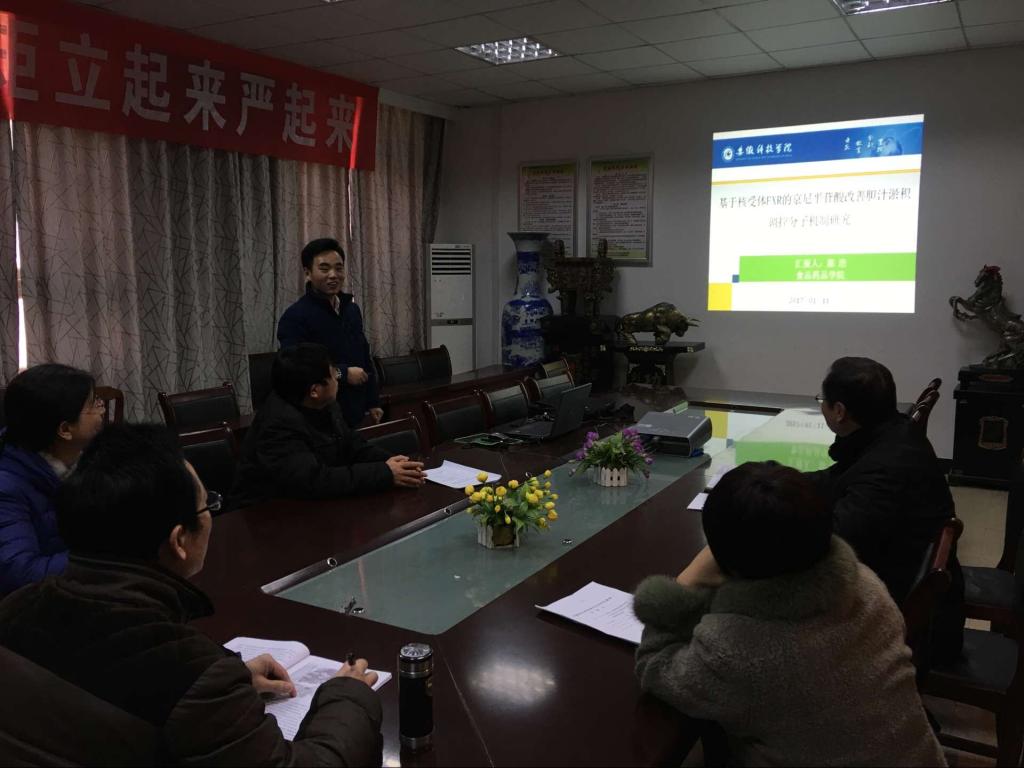 根据安徽科技学院博士引进与稳定人才科研启动基金有关规定,按照学校人事处有关文件要求以及学院工作安排,食品药品学院于1月11日上午在学院会议室组织专家对2016年新进博士陈浩进行了稳定人才科研启动基金项目开题答辩,化学与材料工程学院院长俞浩、细胞与分子生物学分析中心主任张孝林、食品药品学院药学系系主任张新勇、食品药品学院分析与检测中心主任时维静、中药学专业负责人刘汉珍担任本次答辩会评委,答辩会由食品药品学院副院长杜传来主持。