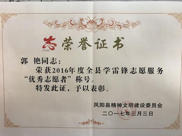3月3日下午,凤阳县举行学雷锋志愿服务主题实践月活动启动仪式,会上公布了2016年凤阳县学雷锋志愿服务优秀志愿者名单,动物科学学院青年志愿者协会会长郭艳获评。