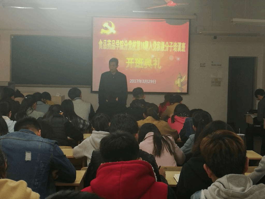 随后,姜毅宣读文件《关于举办食品药品学院分党校第十六期入党积极分子培训班的安排意见》。党员代表药物制剂142班学习委员阮仁洁、学员代表烹饪与营养教育152班宣传委员王鹏相继做表态发言。