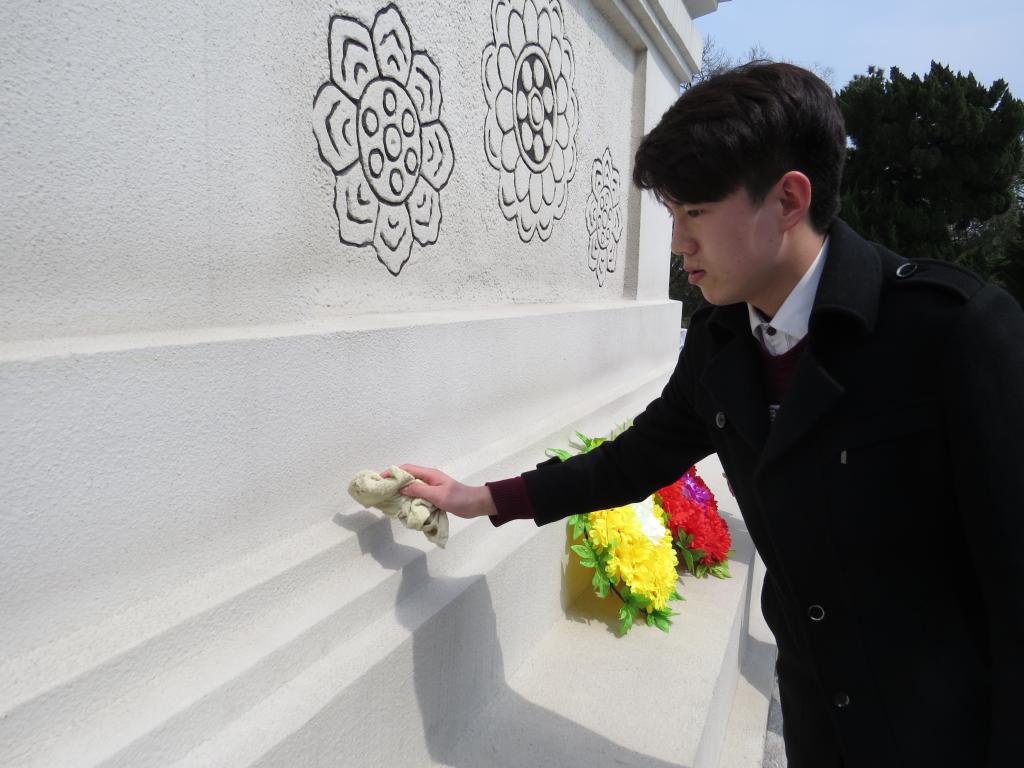 全体成员排着整齐的队伍来到人民英雄纪念碑前。人静默,鸟无语,整个活动庄严肃穆。党员、入党积极分子代表上前扫墓并擦拭墓碑,向烈士敬献花篮。
