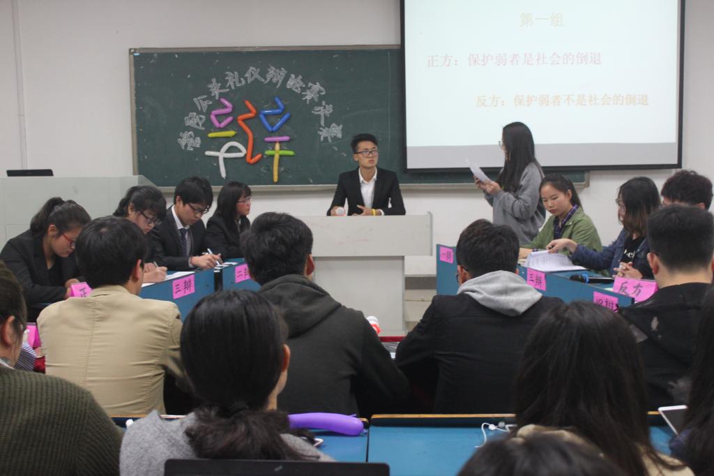 为提升学生的思辨能力、语言表达能力和临场应变能力,增强团结协作意识,提高大学生的自身修养和综合素质,4月8日晚,管理学院于新知楼A111教室举办了首届公关礼仪辩论赛。本次辩论赛由校辩论协会会长周翔、校社联副主席连娜、农学院社联主席方世晨、食品药品学院社联副主席承余、管理学院社联副主席郭璞昊担任评委。