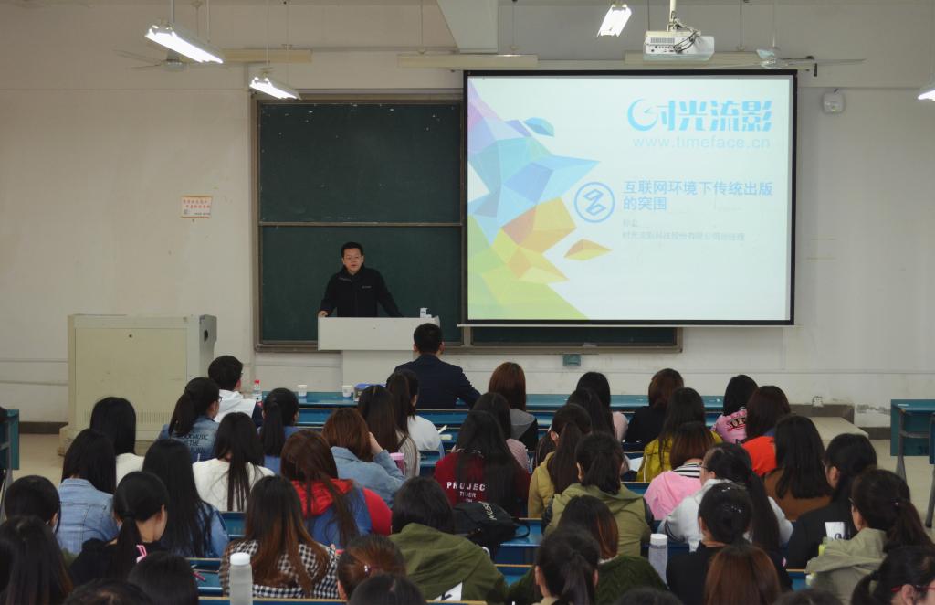 4月12日下午,应人文学院邀请,时光流影科技股份有限公司总经理孙立,在新知楼B301教室,举办题为“互联网环境下传统出版的突围”学术报告。编辑出版学专业师生参加报告会。报告由人文学院副院长李晓东主持。