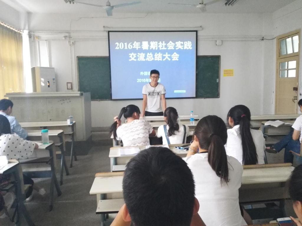9月7日下午,外国语学院暑期社会实践交流总结大会在学知楼310举行。外国语学院党总支秘书,分团委书记张海亮出席会议,各班级校级先进个人、班级负责人参加,会议由分团委委员王梦青主持。