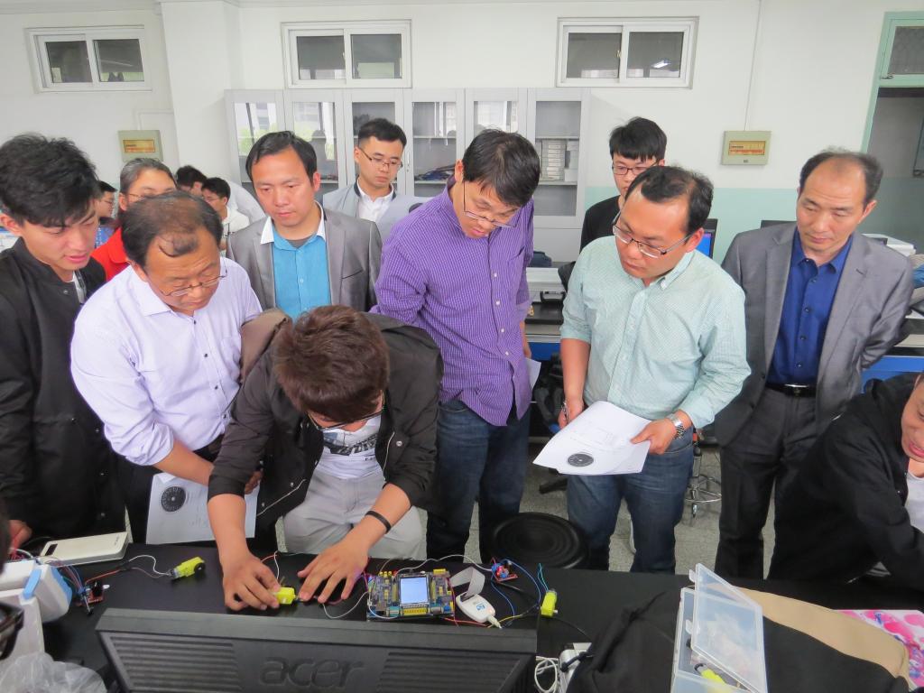 为鼓励更多学生积极参加科创类比赛,提升在校大学生科技创新实践能力提升,5月3日下午,电气与电子工程学院在笃行楼407实验室举办2017年安徽科技学院校级“电子设计暨单片机竞赛”现场测试活动。电气与电子工程学院院长章毛连,党总支书记张盛和团委书记段素梅到现场观摩比赛。测试由徐朝胜、李勇、高海涛、韩新风、王磊等5位老师担任评委,共有34组队伍62名同学报名参加本次竞赛测试。