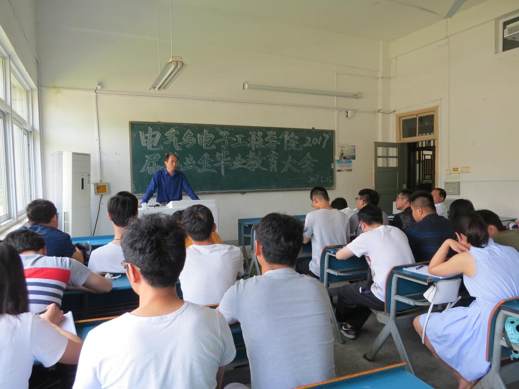 5月25日上午,电气与电子工程学院在学知楼107教室召开2017届毕业生教育大会,党总支书记张盛、全体毕业班班主任、辅导员、各毕业生班级学生骨干、党员参加会议。会议由党总支副书记尚磊主持。