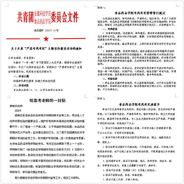 严格制度,抓考风。学院制定了《食品药品学院考风考纪管理暂行规定》、《关于开展严肃考风考纪活动的通知》、《食品药品学院考风考纪承诺书》,明确宣传教育形式和内容、个人行为规范、考场纪律和处罚条例。