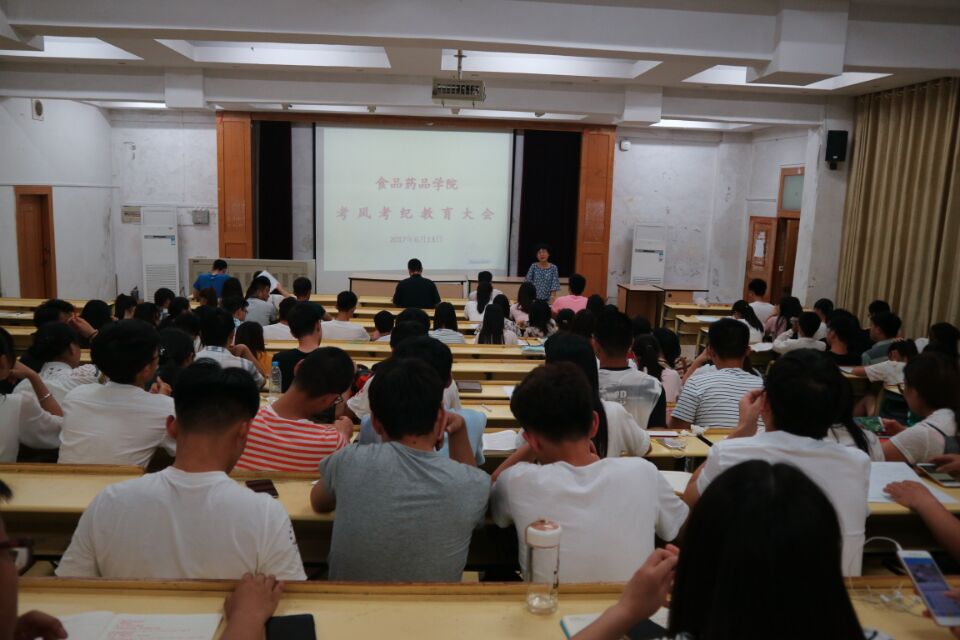 积极部署,重考风。6月13日晚,食品药品学院在学知楼217教室召开考风考纪教育大会,党总支副书记付光玺作动员讲话,他要求全体学生干部要律人律己,以身作则,各班级要及时召开主题班会,动员学生诚信应考,入党积极分子要发挥好结对帮扶作用,切实帮助学业困难学生增强信心、认真复习,以良好的心态迎接期末考试。
