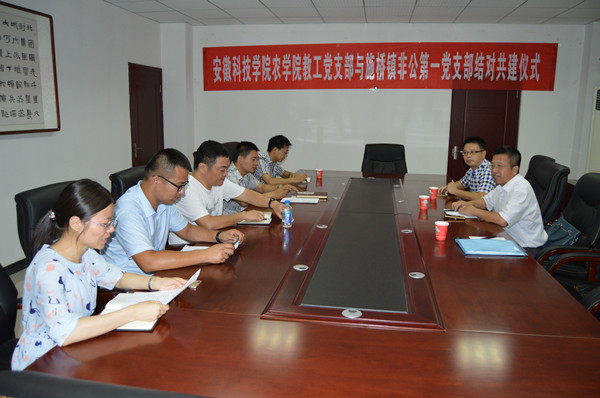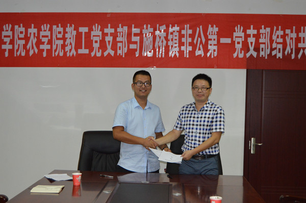 对接共建仪式上,舒英杰和潘显兵代表党支部签订了支部共建协议,双方商定,将在讲微党课、党员业务员培训、科技服务、举行党员活动日等方面开展合作共建。何世潮和李永泽分别代表农学院党总支和施桥镇党委授予中共安徽科技学院农学院遗传育种与种子教研室教工党支部委员会和中共六安市金开区施桥镇非公有制企业第一党支部委员会“联合共建党支部”牌匾,并希望两个支部以此次对接为契机,发挥各种优势,全面深入开展校地党支部共建活动,并以党建推动发展,实现优势互补,合作共赢,将联合共建支部打造成品牌支部,使其在“两学一做”学习教育制度化常态化和党支部标准化建设中的示范引领作用。