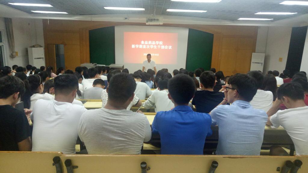9月10日晚,食品药品学院在学知楼216教室召开本学期首次学生干部大会。学院党总支副书记付光玺、副处级辅导员开金苗、正科级辅导员郑玉莲、分团委副书记沈德艳、党总支秘书赵传磊出席会议,学院全体学生干部参加会议。会议由专职辅导员姜毅主持。