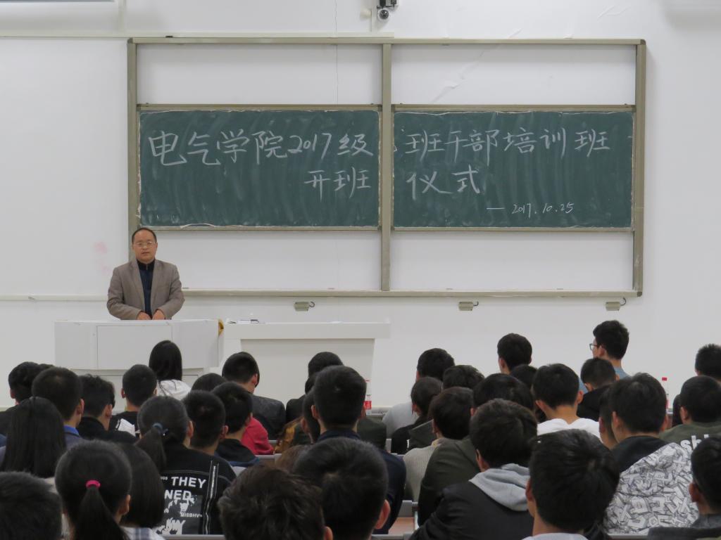 10月25日下午,电气与电子工程学院在龙湖校区致知楼B111成功举办2017级班干部培训班开班仪式。党总支副书记尚磊、分团委副书记王延丽、院学生会主席李鹏、副主席张子玉、人资部部长刘佳佳以及全体17级学生干部参加仪式。本次开班仪式由王晨主持。