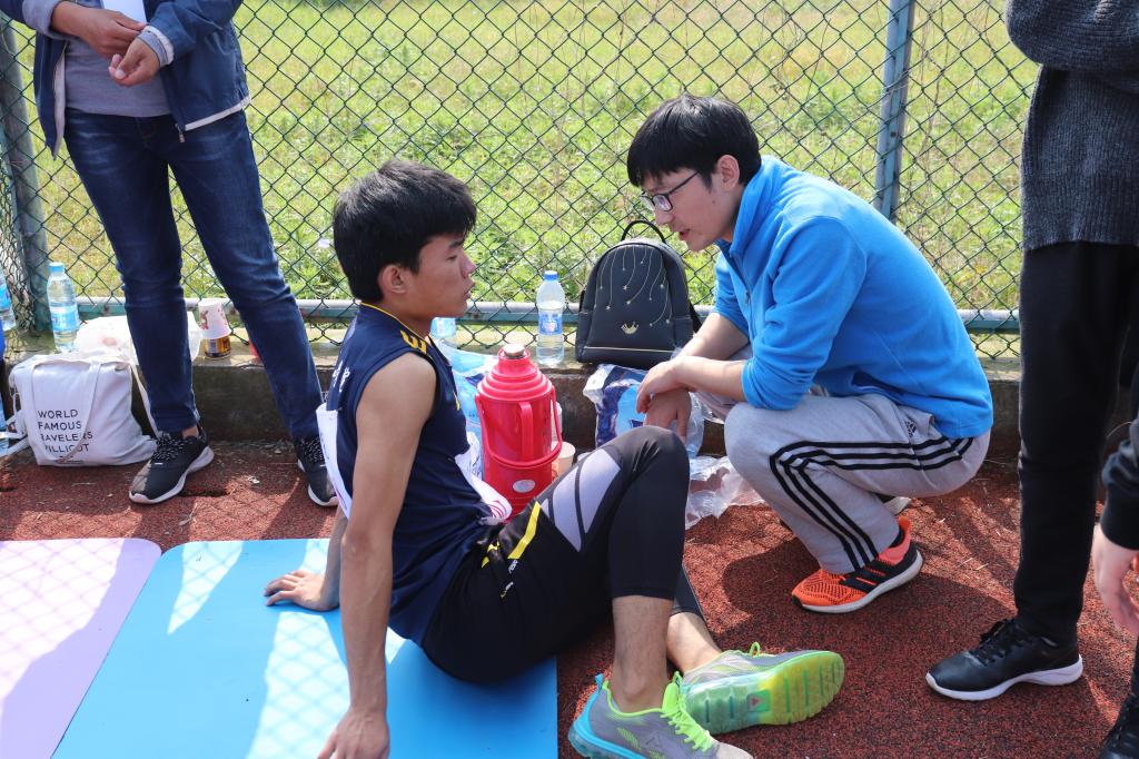 终点的等待,一次次搀扶,一杯杯温水,一声声称赞:“你是最棒的”。学生会后勤组正在为运动员按摩捶腿,缓解赛后疲劳。