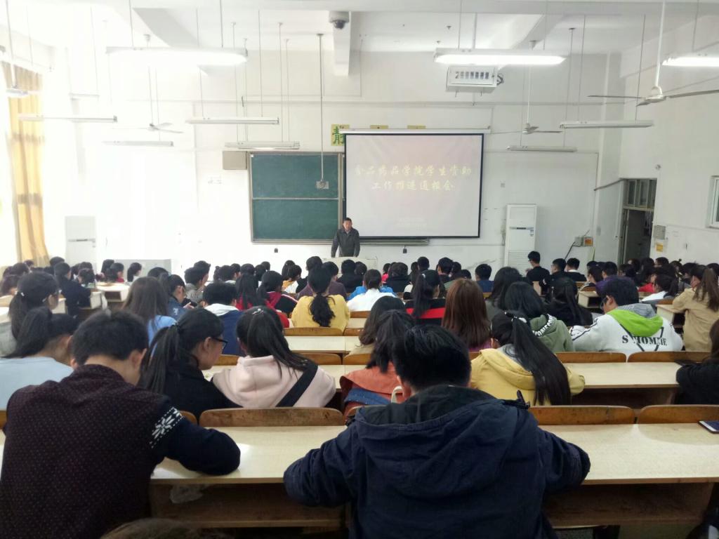 11月2日中午,食品药品学院在求知楼104教室召开学生资助工作推进通报大会。学院副处级辅导员开金苗出席本次会议,16、17级各班生活委员及受助学金、励志奖学金的资助同学参会。
