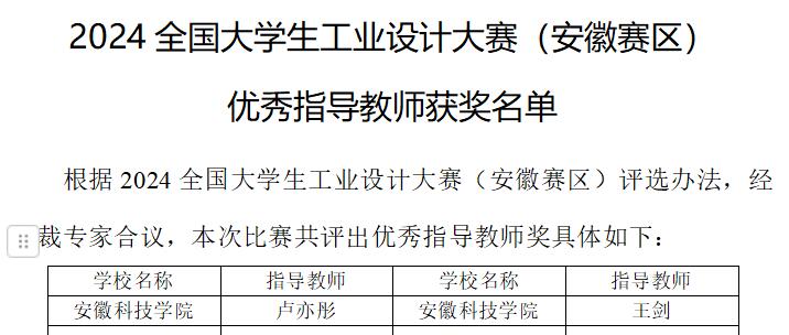 近日,由安徽省教育厅主办、安徽工业大学承办的2024全国大学生工业设计大赛(安徽赛区)(B类)评审获奖名单公布,我校工业设计专业在限额20项的情况下,荣获15项省级奖,其中省赛一等奖3项,二等奖3项,三等奖9项,获奖数量再创新高。我校王剑、卢亦彤老师荣获安徽赛区优秀指导教师。