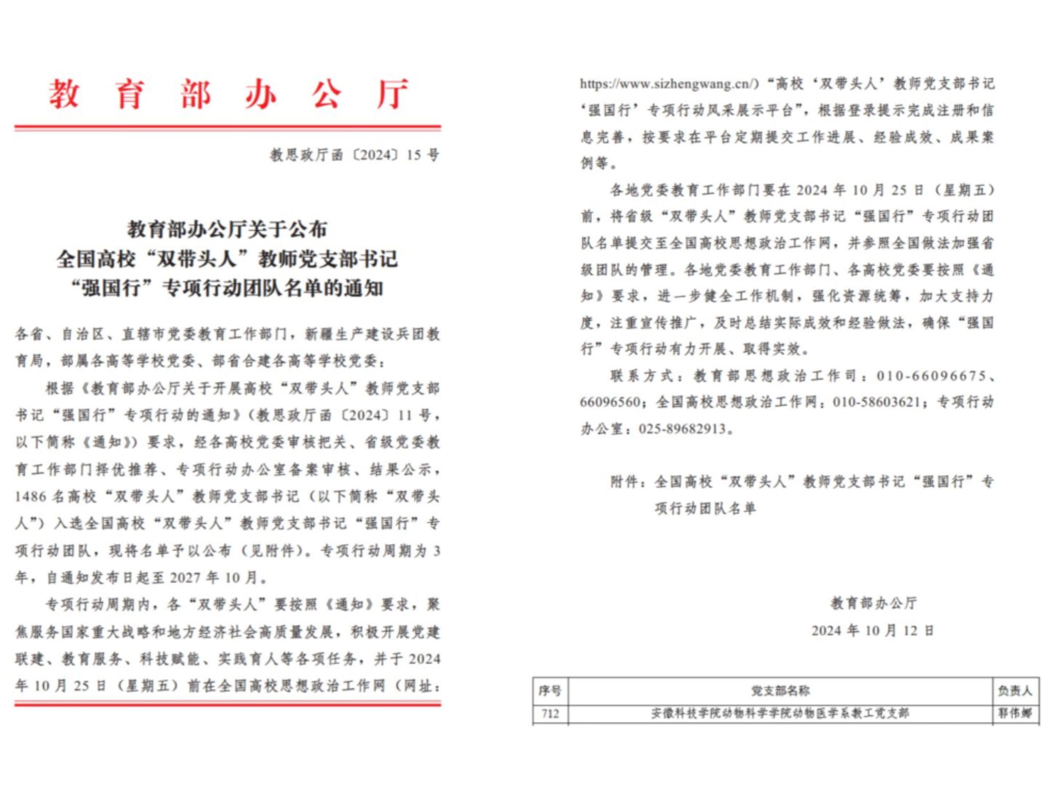 2024年4月16日,教育部办公厅公布新一批全国党建工作示范高校、标杆院系、样板支部培育创建单位名单。我校动物科学学院动物医学系教工党支部成功入选“全国党建工作样板支部”培育创建单位。10月12日,教育部办公厅公布全国高校“双带头人”教师党支部书记“强国行”专项行动团队获批名单,我校动物医学系教工党支部入选,党支部书记为郭伟娜老师。这是我校基层党组织建设取得的又一项重要成果。