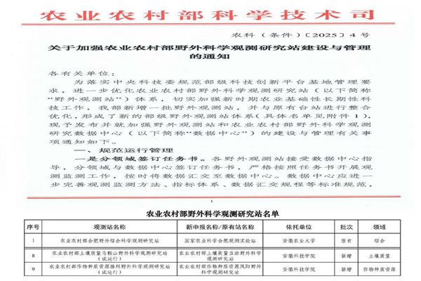 近日,由安徽科技学院申报的“农业农村部土壤质量马鞍山野外科学观测研究站”“农业农村部作物种质资源滁州野外科学观测站”获批立项建设,这是我校首次获批农业农村部野外科学观测研究站项目,标志着学校在服务国家农业战略方面迈出关键一步。