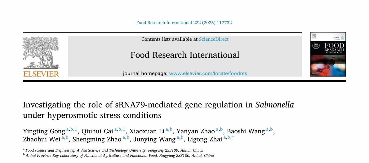 近日,我校食品科学与工程学院食品质量与安全团队在农林学科领域顶级期刊《Food Research International》(中国科学院1区top期刊,影响因子8.0)发表最新研究成果。论文题为“Investigating the role of sRNA79-mediated gene regulation in Salmonella under hyperosmotic stress conditions”,由我校2023级食品加工与安全领域研究生龚莹婷为论文第一作者,翟立公副教授为通讯作者,安徽科技学院为第一完成单位。