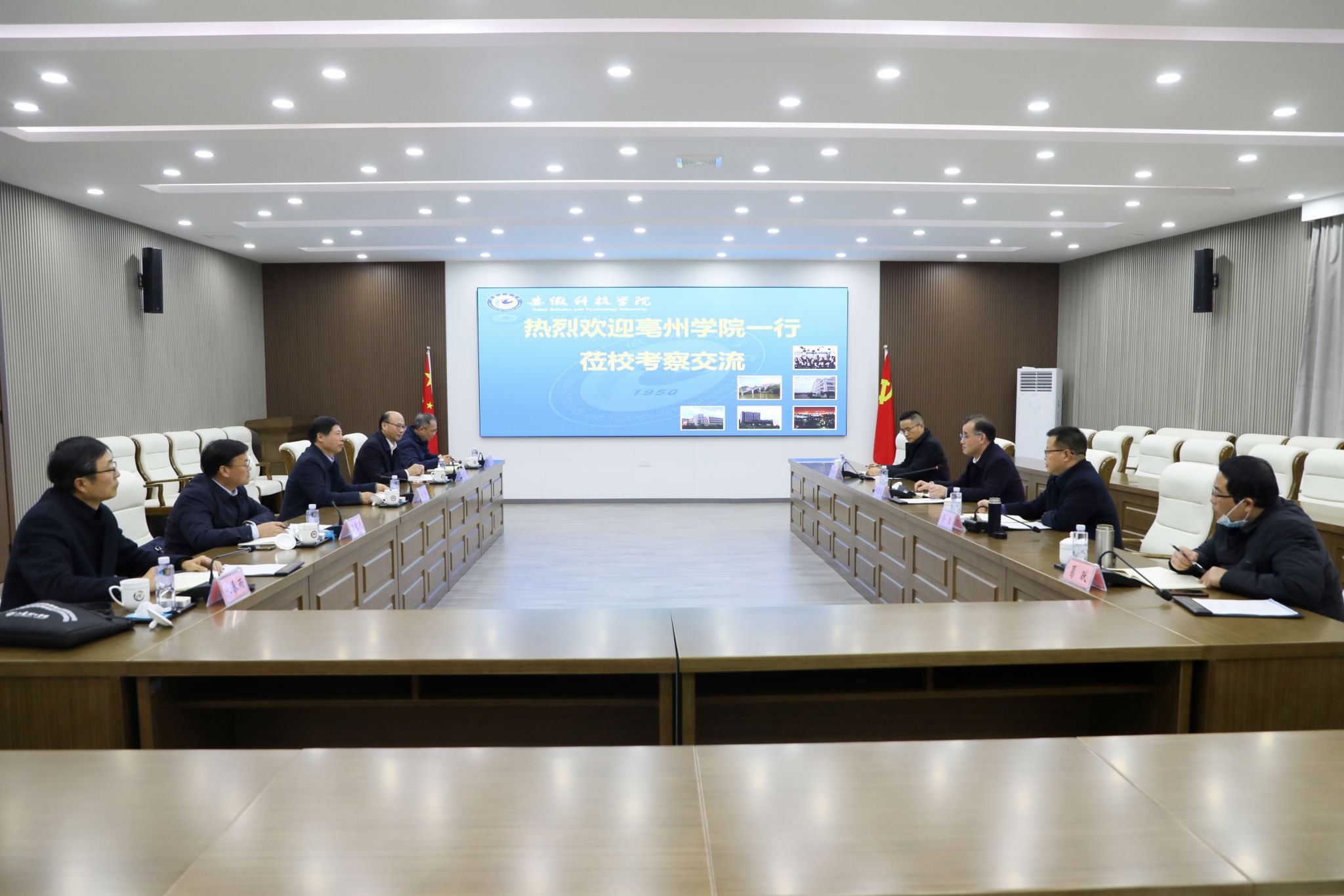 时伟对胡恩彪、俞浩一行的到访表示热烈欢迎,并简要介绍了我校近年来在办学治校方面取得的主要成果、多校区治理的实践经验、未来发展战略以及当前发展与改革中的重点任务。胡恩彪对我校近年来的发展成就和良好发展态势表示赞赏,衷心感谢安徽科技学院长期以来的支持与帮助,希望两校未来进一步加强沟通、深化合作,携手推动事业高质量发展。俞浩介绍了亳州学院近年改革、建设与发展情况,表达了进一步深化校际合作的良好意愿。