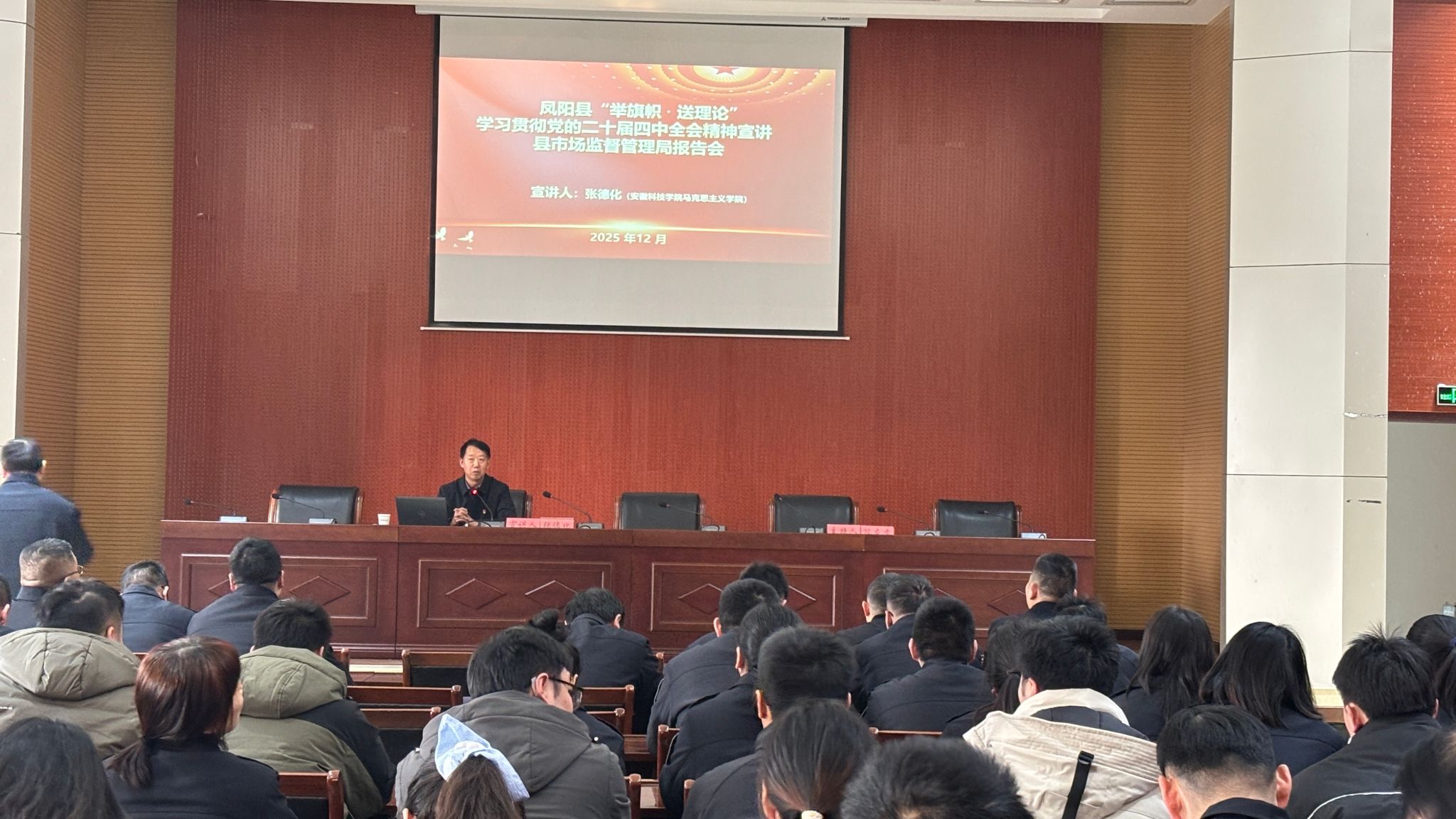 近日,我校与凤阳县委宣传部联合开展“举旗帜·送理论”学习贯彻党的二十届四中全会精神宣讲活动。我校宣讲团成员、马克思主义学院8名骨干教师应邀深入全县机关、社区、学校等单位开展系列宣讲。