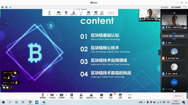 8月23日-25日,滁州市计算机学会2020年信息技术文化节通过线上腾讯会议的形式如期举行,我校信息与网络工程学院教师曹浩博士应邀参加会议并做题为“区块链技术的发展与应用”的大会主题报告。