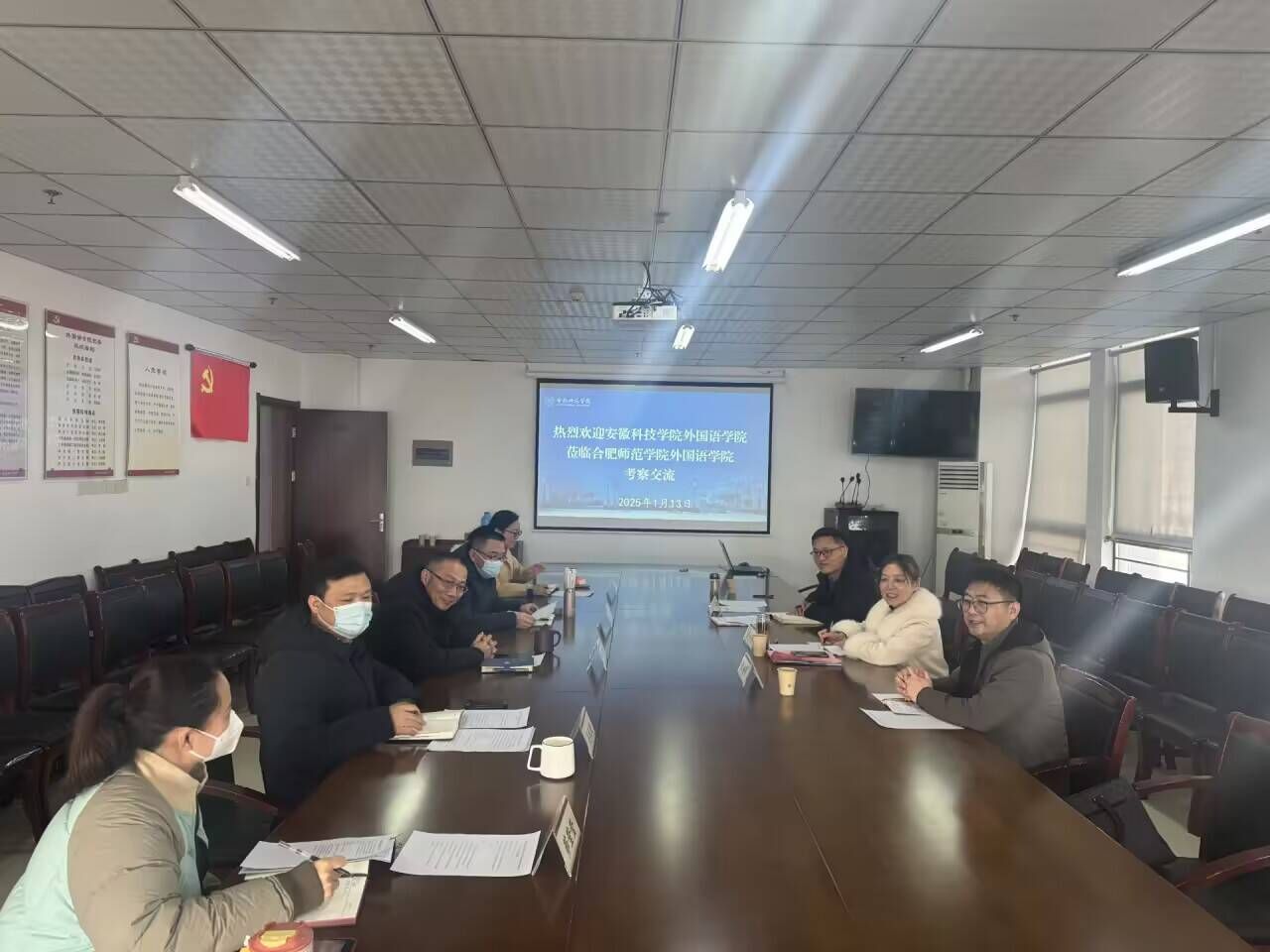 为推进学院招生就业工作和师范类专业二级认证整改工作,1月13日上午,外国语学院党委书记蔡为青,党委副书记张海亮,副院长洪民一行三人赴合肥师范学院调研。合肥师范学院外国语学院党委书记马四民,院长李可胜,党委副书记杨娜,副院长吴礼敬、英语(师范)专业负责人茆莹莹出席了调研交流会。