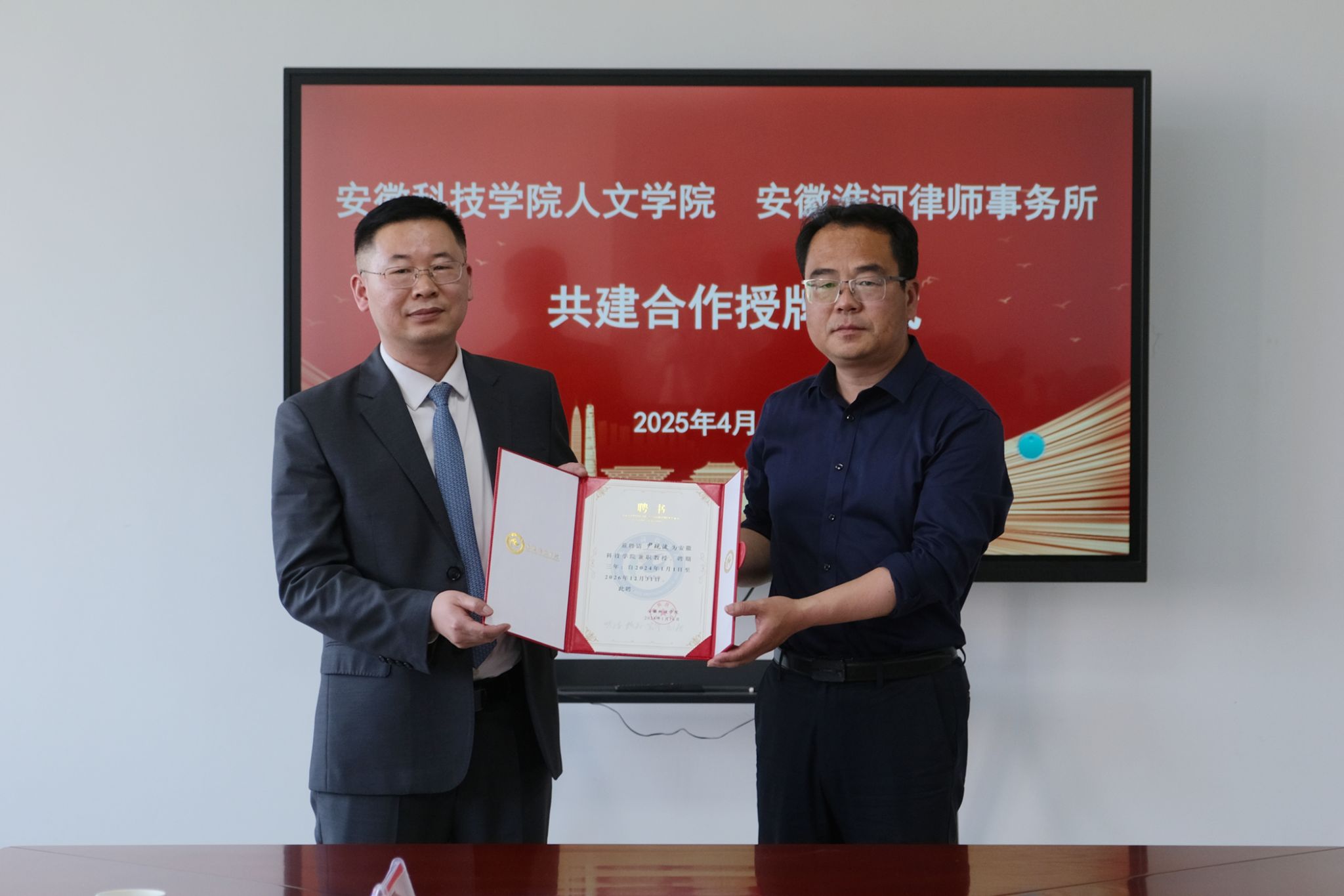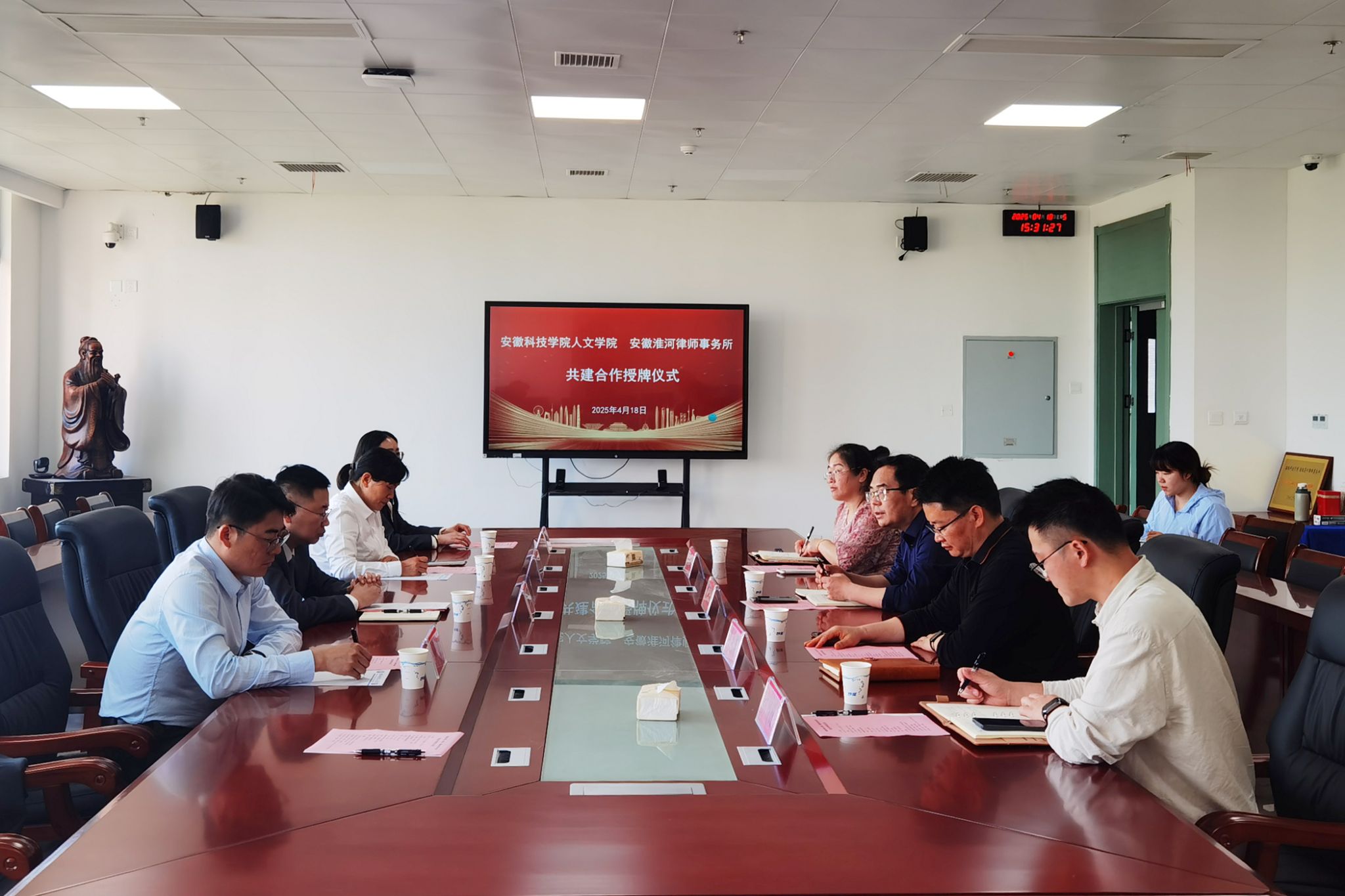 4月18日下午,人文学院与安徽淮河律师事务所在人文学院313会议室举行共建合作授牌仪式。安徽淮河律师事务所主任尹现波一行4人,人文学院党政领导班子成员和教师代表出席。仪式由副院长牛永辉主持。