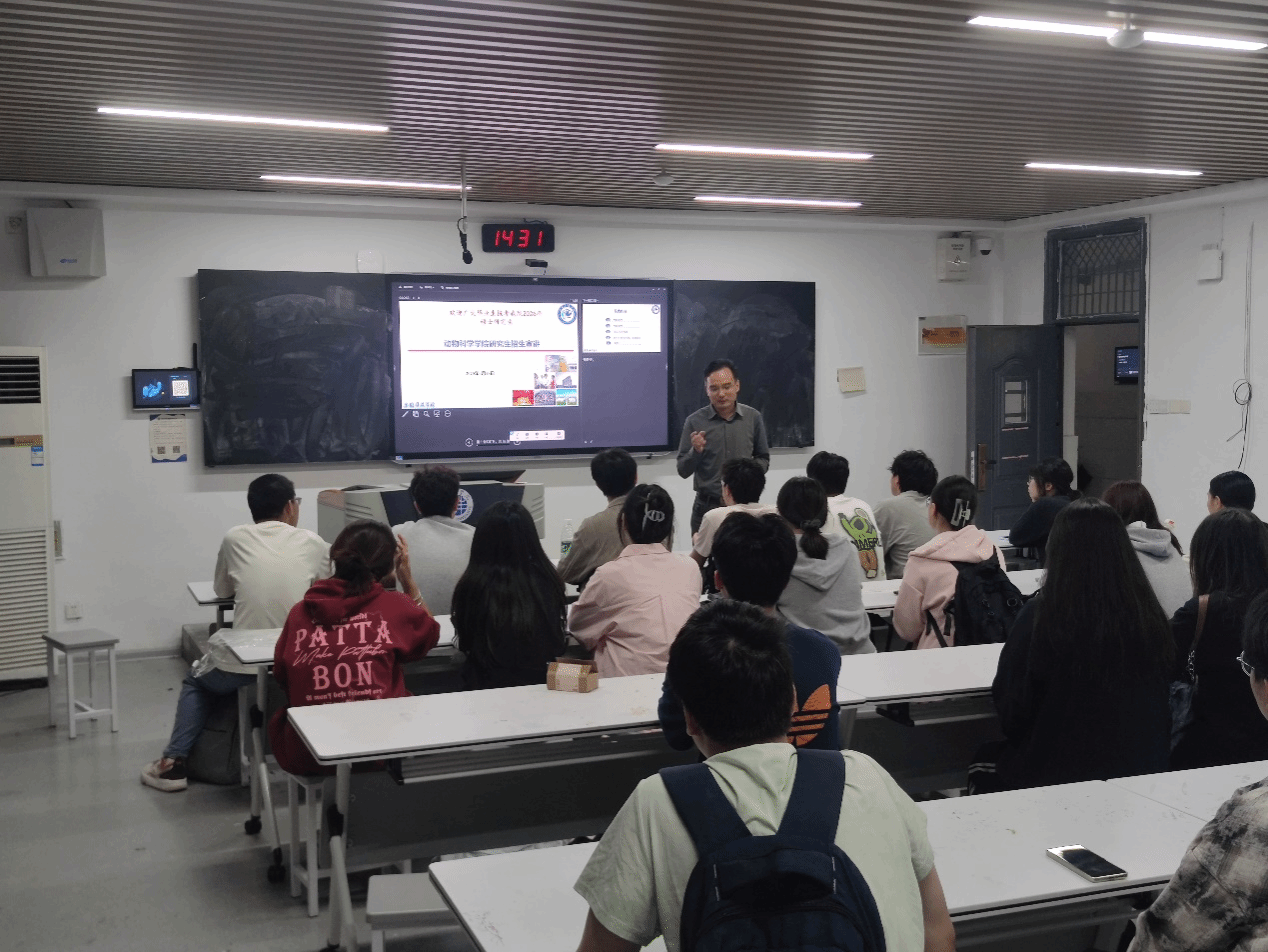 宣讲会上,周金星阐释了学院专门针对生命科学类、生物类相关专业学生推介畜牧和兽医专业硕士的原因和优势,介绍了学校和学院的悠久办学历史等以及近年来在科学研究、人才培养方面取得的突出成就,并就学院2026年硕士研究生招生政策进行了解读,与部分学生就具体招生政策进行了交流。