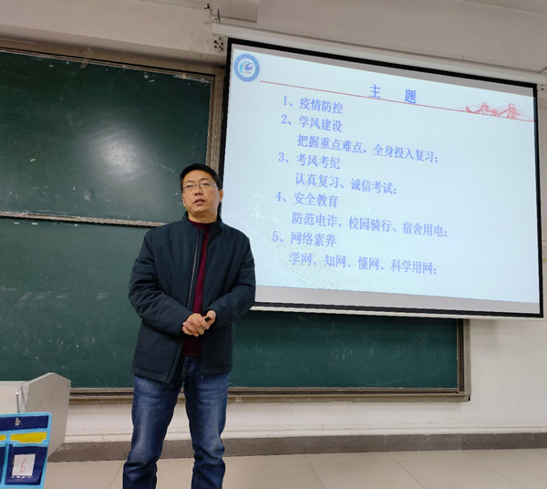 张轶辉带领与会学生分析了当前疫情防控形势,要求同学们树立“大家是自己健康的第一责任人,是疫情防控的第一道防线”理念,切实做好防护。张轶辉着重开展了学风、考风、考纪教育,要求同学们把握课程学习的重点难点,全身心投入复习,诚信考试。在安全方面,张轶辉号召大家要杜绝“贪图小便宜”想法,树立“勤劳致富、合法劳动致富”理念,切实防范电信诈骗。校园骑行一定要注意安全,在宿舍要安全用电。最后张轶辉还开展了网络素养教育,要求大家学网、知网、懂网、科学用网。