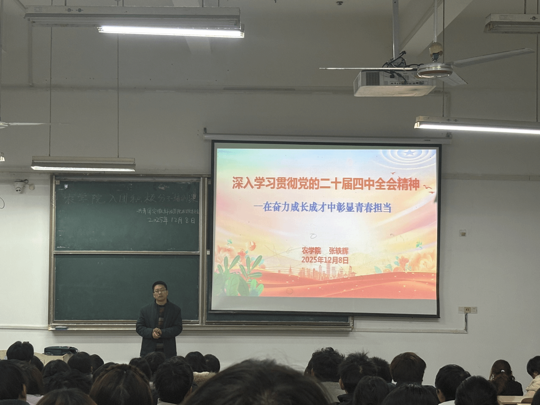 为强化青年学生思想引领,凝聚青春奋斗力量,12月8日晚,农学院在求知楼A103举办青马工程培训暨入团积极分子培训。农学院党委副书记张轶辉主讲,140余名入团积极分子及青马工程学员参加。