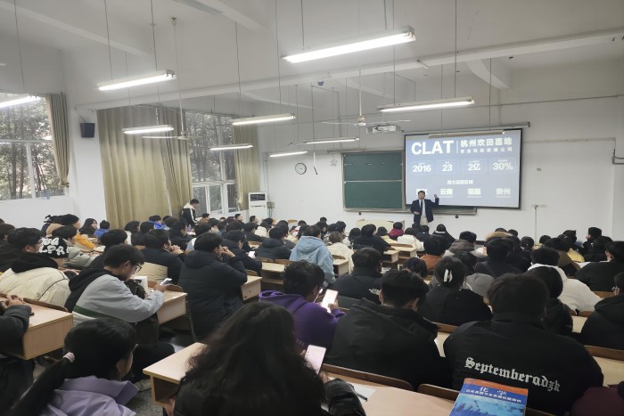 2023年12月27日下午,杭州欢田喜地农业科技有限公司校友携手安徽科技学院农学院共同举办的大学生就业指导宣讲会在求知楼A107教室顺利召开。参会人数达130余人,本次会议由农学院党委副书记张轶辉主持,杭州欢田喜地农业科技有限公司2017级植保、农学优秀毕业生韩璞、张祥主讲。