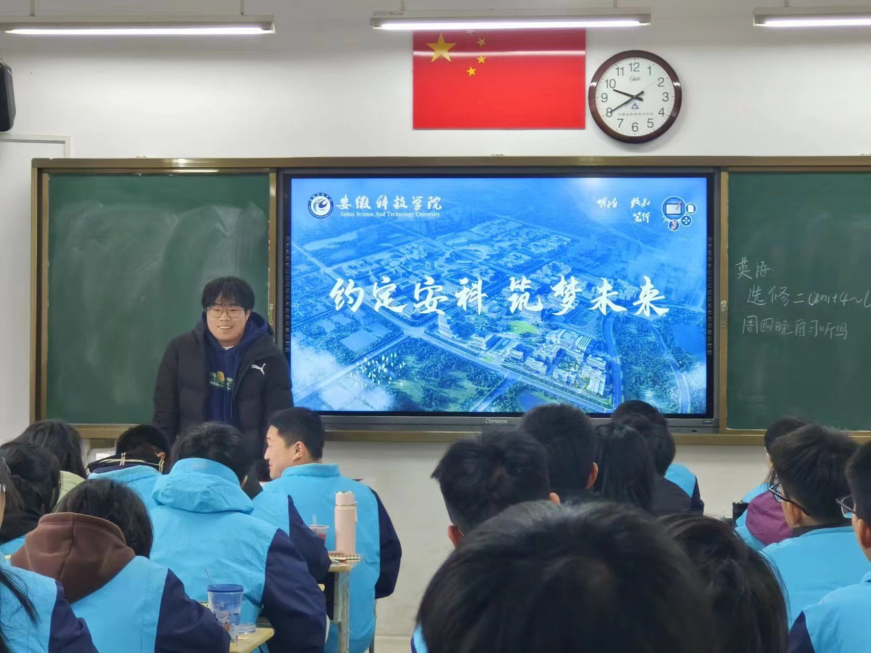回到母校后,团队成员首先看望了高中班主任和任课老师并进行亲切交流,向母校老师汇报了大学生活和学习的方方面面。随后,在高中班主任老师的带领下,团队成员来到班主任所带高二班级开展招生宣讲活动,播放2023年安徽科技学院招生宣传片,对安徽科技学院办学历程和发展规划进行了概述性地介绍。并由队长万子翔从历史底蕴、发展前景、学科专业、条件保障、人才培养和质量六个方面详细介绍了安科70多年的文化沉淀。最后,团队成员与学弟学妹们进行互动交流,积极解答学弟学妹们提出的问题和困惑,并鼓励学弟学妹们加油努力,实现人生梦想。