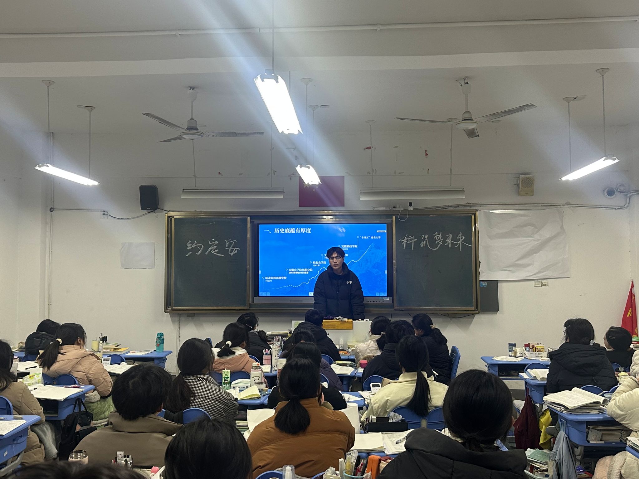 在高中班主任的带领下,实践团队来到了高三年级20班,并开展了宣讲活动。从学校的历史底蕴,发展前景,学科专业,教学条件,人才培养,人才培养质量等多个方面向同学们详细的介绍了安徽科技学院。同时播放了“约定安科,筑梦未来“的宣传短片,让同学们直观深刻的认识了安徽科技学院。实践团队成员李文康向同学们讲述了自身高考经历,解答了同学们关于高考的种种疑问,也向同学们讲述了自己的学习方法和经验,同时祝愿全体学生金榜题名,以梦为马,不负韶华。