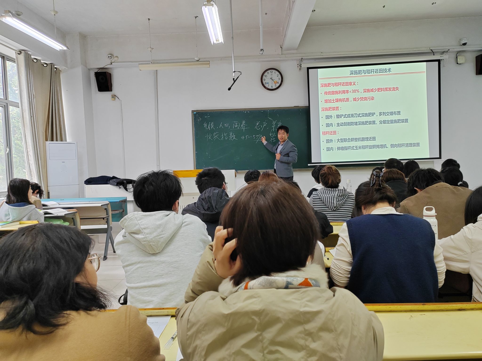 姚波老师围绕“播种机关键部件技术进展与发展”,从播种的重要性切入,对比了传统人工播种与机械化精量播种的差异,详细讲解了“种床整理→排种→导种投种→覆土镇压”四大核心环节。课堂中,他结合大量实例与图示,介绍了从20世纪40年代机械式排种器到气力式、离心式、气送式等集排技术的发展历程,并重点分析了机械式、气力式及集中排种三类技术的工作原理。姚老师还分享了排种性能试验、离散元优化及可调排种器等最新研究进展,指出当前技术仍面临通用性差、种子需包衣丸粒化、成本较高等瓶颈。听课过程中,课堂氛围活跃,学生认真听讲、积极思考。