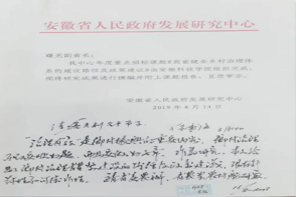 近日,由我校管理学院张德化教授主持的省政府发展中心课题的研究报告《我省健全乡村治理体系的建设路径及政策建议》,获得安徽省副省长张曙光的明确批示。