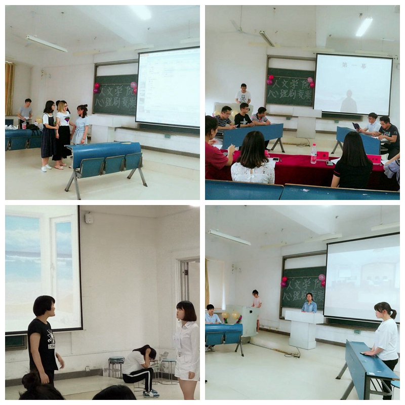 为了向在同学们宣传介绍心理健康相关知识,呼吁大家关注自我、爱惜自我,提高大学生们心理自助与互助能力,人文学院于5月14日下午在新B301举办了校园心理剧大赛。校演讲与口才协会主席王美娜、外国语学院心联主席孙淑君、管理学院心联主席沈艳茹、人文心联前主席周鑫担任比赛评委。比赛由何春霖主持。