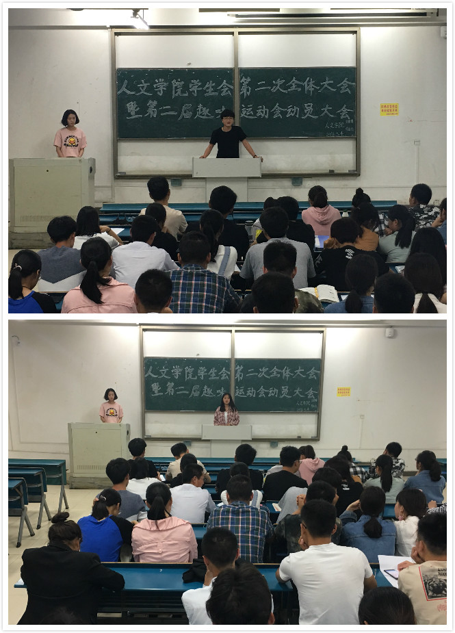 5月4日晚,人文学院学生会第二次全体大会暨第二届趣味运动会动员大会于新知楼B301教室举行。人文学院第七届学生会全体成员参加会议,大会由学生会主席祝沐瑶主持。