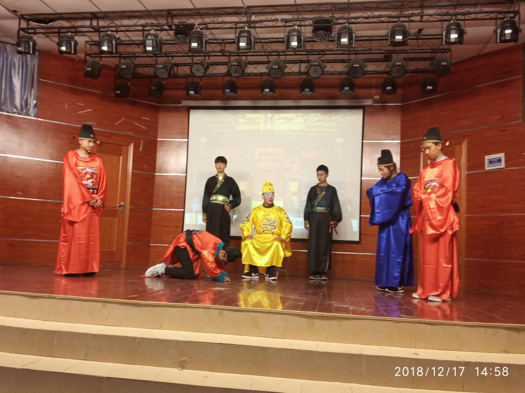 本次历史剧由刑事法教研室田野老师指导,编剧、导演、服装、道具、字幕、音响、灯光等剧组人员以及全体演员均由18级法学专业同学担任。作为翻转课堂的一种实现方法,历史剧情境教学把演出成果作为课程过程性考核的评价标准,促使全体同学在筹备演出的过程中,进一步增强了对课程的学习兴趣,加深了对相关历史知识的印象,形式新颖、内容活泼的教学方式获得了同学们一致的好评。(特约通讯员:李沙娜)